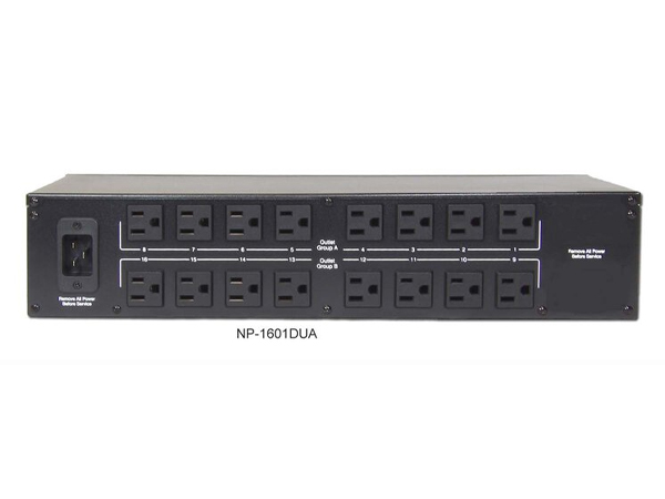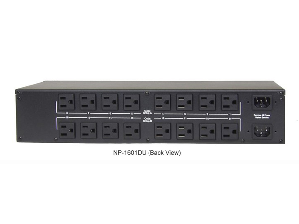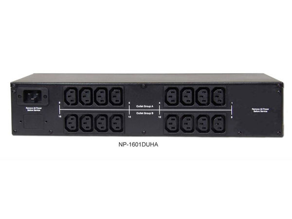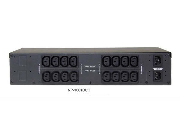 NP-1601DU: 2个输入插座 IEC320-C14,16个输出插座NEMA 5-15R,A组(1-8)15A,B组(9-16)15A